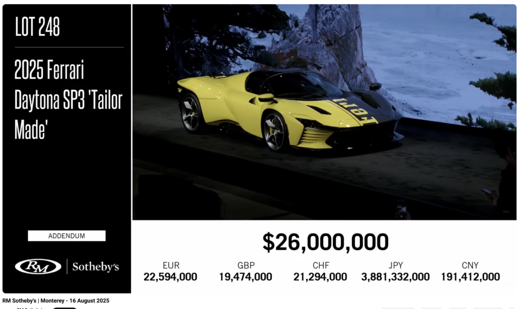 Monterey Car Week 2025 has come and gone, and so to have the amazing auctions that accompany it. While an article could be written about every car that crossed the blocks, the obvious one we must discuss is the 2025 Ferrari Daytona SP3 which hammered at RM Sotheby’s for an astounding $26,000,000!