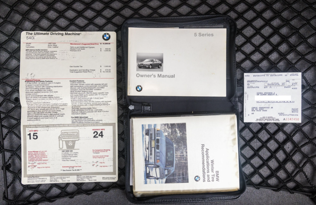 Steve Dinan registration card just casually sitting next to the window sticker and owner’s manuals.