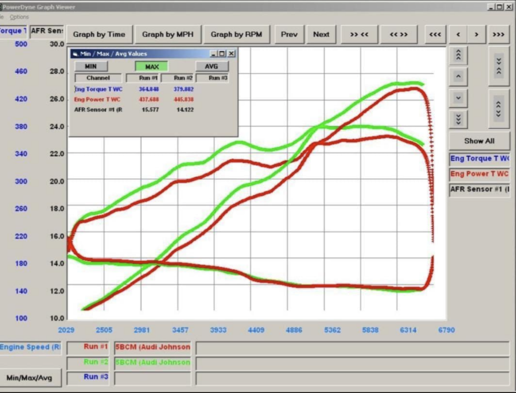 Dyno chart showing the car’s current horsepower. Love the period correct Windows 98 (?) program apparently used.
