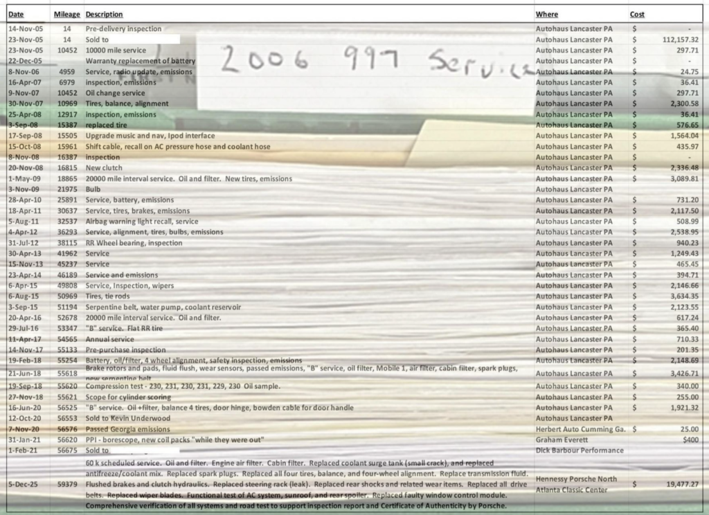Service costs for the Club Coupe over the years. Big bills, which look due to it being serviced entirely by Porsche dealerships. New owner might consider using a quality independant.